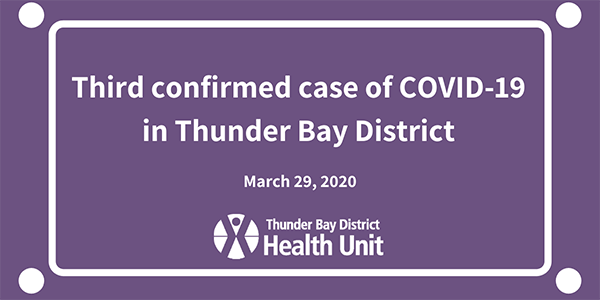 March 29, 2020 - Today, Dr. Janet DeMille, Medical Officer of Health of the Thunder Bay District Health Unit (TBDHU), confirmed the third case of COVID-19 in the TBDHU region.